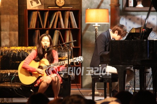 ▲ 합동공연을 선보이는 오지은과 노리플라이 [투데이코리아=임주희 기자] 지난 23일 오후 6시 30분 서울시 마포구 상암동 CJ E&M 센터에서 'Mnet 다락방 어쿠스틱 라이브 A-Live 두 번째 이야기'의 현장공개가 열린 가운데 오지은과 노리플라이가 'Love Song'를 선보이고 있다.