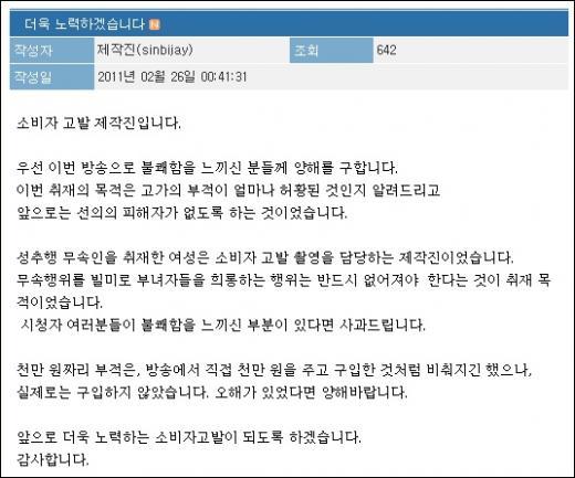 이어 "성추행 무속인을 취재한 여성은 소비자 고발 촬영을 담당하는 제작진이었다. 무속행위를 빌미로 부녀자들을 희롱하는 행위는 반드시 없어져야 한다는 취재 목적이었다"라며 "불쾌함을 느끼신 부분이 있다면 사과드립니다"라고 공식적으로 사과했다. 또 "천만원짜리 부적은 방송에서 직접 천만원을 주고 구입한 것처럼 비춰지긴 했으나 실제로 구입하지 않았다. 오해가 있었다면 양해바랍니다"라고 덧붙였다.