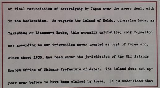 이같은 일본측의 억지 주장에 대해 뒤늦게 알게된 우리정부는 1951년 7월 19일 구화조약 제2항에 명시된 竹島(독도)는 잘못된 것이라며 수정을 요하는 탄원서를 美 국무성으로 보냈으나 미국은 1951년 8월 10일 국무차관보 라스쿠를 통해 보낸 회신에서 “1905년이후 일본 영토가 된 것을 확인했으니 수정을 들어줄수 없다”고 했다는 당시의 후문을 함께 전했다.