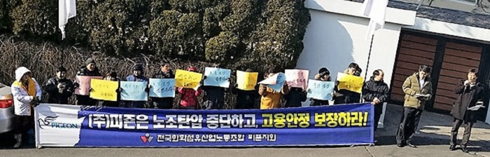 지난 2013년 민주노총 피죤지회는 임산부 2명이 포함된 노조원 20여명이 피죤노조 해산 압박과 피죤 직원들의 고용안정을 주장하는 집회를 당시 피죤 이윤재 회장의 자택 앞에서 가졌다.