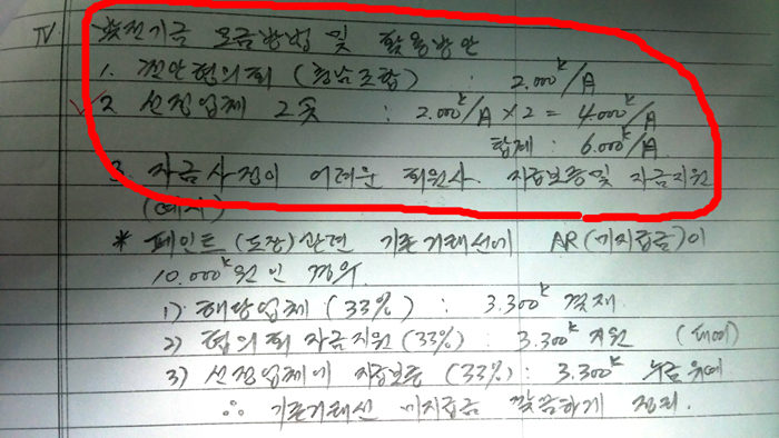 또한 실행계획으로는 협의회 임원진의 솔선수범과 고문진의 자발적 참여유도 및 충남조합차원에서의 지원 등 세부적으로 작성되어 있다. 아울러 발전기금 모금방법 및 활용방안에서는 발전기금 모금을 통해 자금사정이 어려운 회원사에 대해 지원하는 내용 등이 상세히 기술되어 있었다.