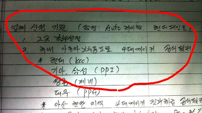 이 자료에는 협의회 업체 선정기준으로 현재 천안, 아산지역의 80~85%를 장악하고 있는 A업체와 H업체를 잠정업체로 선정하고 ㄷ업체와 ㅎ업체는 공식딜러권이 없다는 이유로 배제 시켰다.