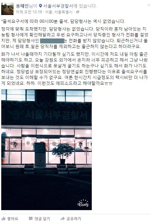 내용에는 “정각에 맞춰 도착했지만 담당 형사는 없었다. 당직이라 혼자 남아 있는 형사에게 확인해달라고 두 번 요구하고 나서 담당 형사에게 전화했지만 받지 않았다”며 “퇴근하신거냐고 물어보니 원래 토,일은 당직자를 제외하고 출근하지 않는다고 하더라”고 말했다.