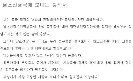 본지가 14일 단독입수한 '남조선 당국에 보내는 항의서'는 한국 내 사드 배치가 가시화되던 지난 10일 중국 저장성 닝보 소재 '진달래 친선관'에서 근무했다는 최례영(28)이라는 여성 명의로 작성됐다.