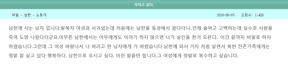 [투데이코리아=오주한 기자] "탈북녀와 (결혼을 꿈꾸며) 사귄 남한 남자다. 끝까지 비밀로 하자 했다. 그런데 딴 남자에게 가 버렸다. 정말로 복수하고 싶다. 죽이고 싶다"