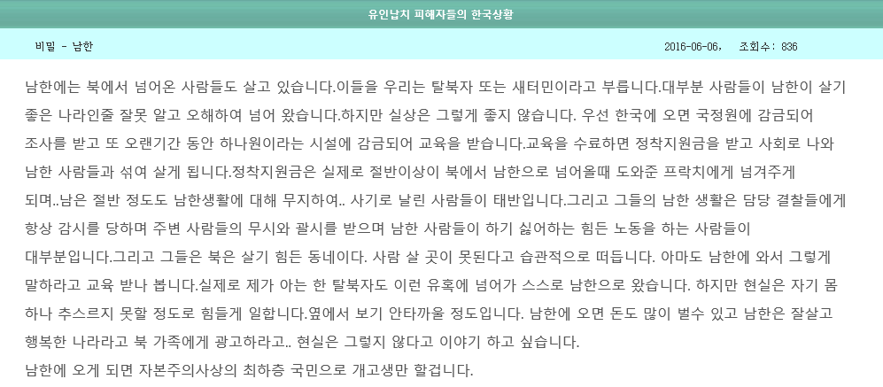 실제로 A는 전 날(6월 6일) 독자투고 게시판에 올린 '유인납치 피해자들의 한국상황'이라는 또다른 글에서 "원수님(김정은)의 전사"가 되고 싶다는 뉘앙스의 의지를 드러냈다.