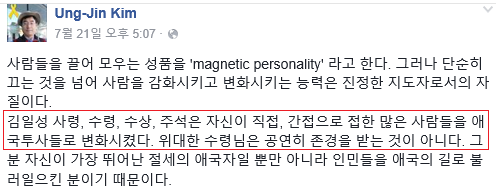 김 전 소장은 자신의 페이스북 계정에 북한 김일성 회고록 '세기와 더불어' 일부를 올리면서 "8권 전부 OO에 있다"고 '추천'하는가 하면 7월 23일 일제치하 해방에 대해 "의심할 여지 없이 김일성 장군과 조선인민혁명군의 공로"라고 주장했다.