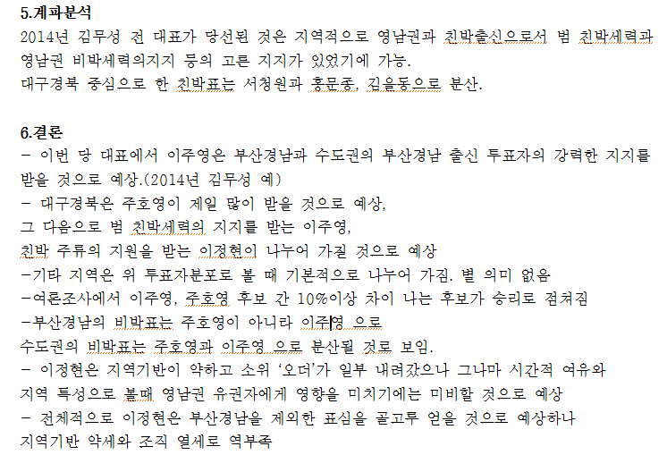 문건은 영남권 출신인 이주영 후보가 PK 몰표와 함께 TK에서도 같은 영남권 출신인 주호영 후보 다음으로 많은 표를 획득할 것으로 내다봤다. PK의 비박 표는 이주영 후보에게 몰릴 것으로, 수도권 비박 표는 주호영 후보와 이주영 후보로 분산될 것으로 분석했다.