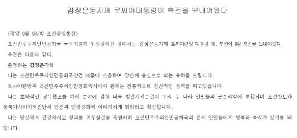 중통은 "로씨야련방(러시아연방) 대통령 '웨. 뿌찐(블라디미르 푸틴)'이 9일 축전을 보내여왔다"고 전했다.