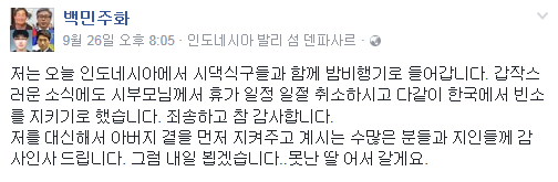 '통OO'라는 필명의 네티즌은 27일 자신의 블로그 포스팅에서 "백민주화는 부친 진상규명 청문회 날인 9월 12일 서울에 있었다"며 "이튿날 13일 인도네시아 발리섬으로 갔다"고 고발했다.
