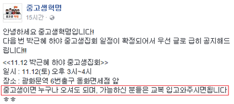 7일에는 민중총궐기가 예정된 11월 12일 "광화문역 동화면세점 앞에서 '박근혜 하야 중고생집회'를 한다"며 "중고생은 누구나 오셔도 된다. 교복 입고 와달라"고 요구했다.