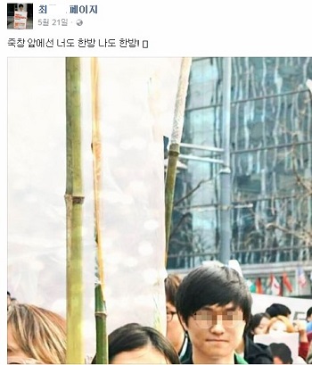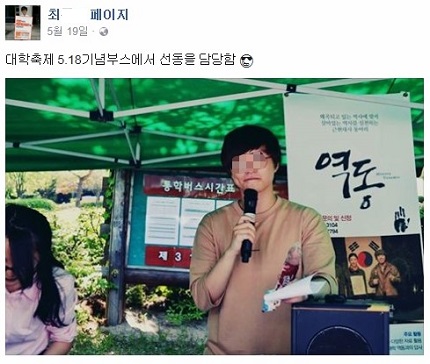 5월 21일 페이스북 게시물에서 "죽창 앞에선 너도 한방 나도 한방!"이라며 죽창을 든 듯한 자신의 사진을 올렸다. 5월 19일에는 "대학축제 5.18기념부스에서 선동을 담당함"이라며 마이크를 든 자신의 사진을 올렸다.