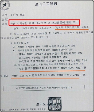 이 공문은 경기도 학생인권조례 제16조 등을 들면서 "학생의 의사표현 행위 자체를 이유로 하는 경고나 징계 지양" 등을 요구하고 있다.