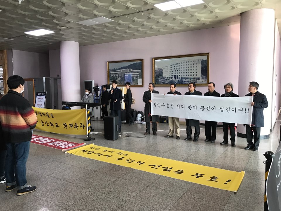 ▲ 지난 2016년 11월 8일, 총신대 교수협의회와 학생들의 김영우 총장 퇴진 촉구 단체농성 모습(사진=오승환 기자)이들은 “학교 행정의 비정상적 운영과 2년 이상 계속된 재단 이사회의 파행 원인은 전적으로 김 총장에게 있다”며 “김 총장의 사퇴가 없는 한 학교와 재단이사회의 정상화는 불가능하다”고 밝히며 김 총장의 사퇴를 촉구했다.