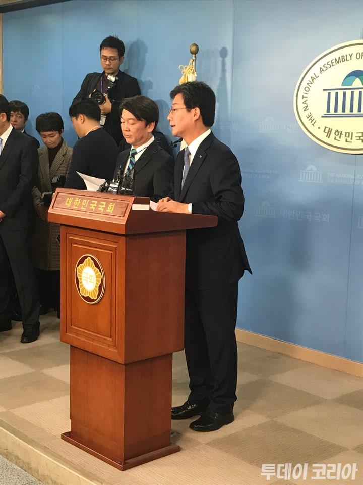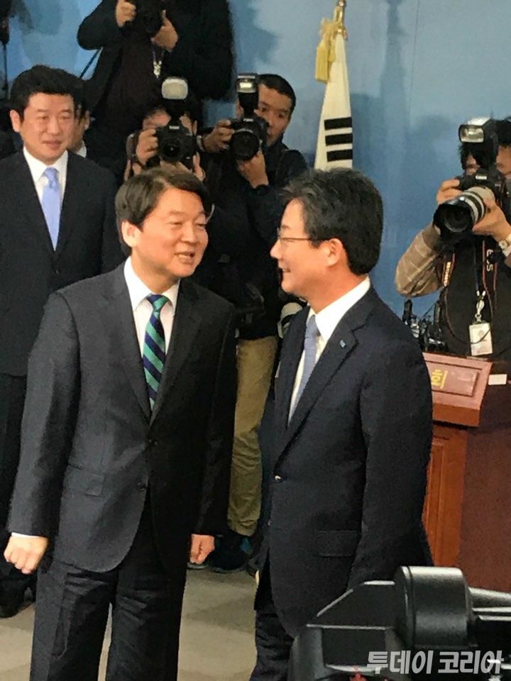 ▲ 안철수, 유승민 대표가 기자회견을 끝내고 이야기 하고 있다.[투데이코리아=권규홍 기자] 지방선거를 앞두고 국민의당 안철수 대표와 바른정당 유승민 대표는 18일 11시경 국회 정론관에서 기자회견을 열고 공식으로 통합을 선언하며 당 이름을 '통합개혁신당(가칭)'으로 내걸었다.