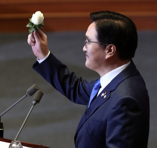 ▲ 지난 1월31일 국회 교섭단체 대표연설에서 성추행 폭로 지지의미의 백장미를 들어보이며 웃고 있는 우원식 더불어민주당 원내대표.[투데이코리아=오주한 기자] “사타구니 사이로 손을 넣어 이리저리 주물렀다”