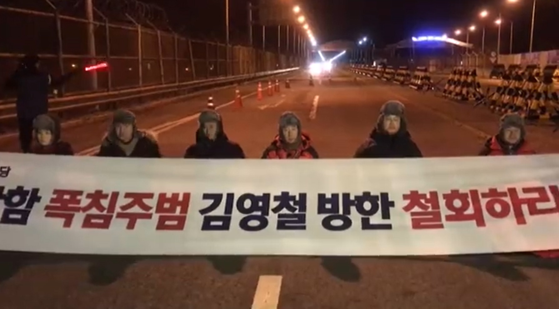 김성태 원내대표, 김무성 ‘김영철 방한 저지 투쟁위’ 위원장, 함진규 정책위의장, 장제원 수석대변인 등은 24일 오후 장외 의원총회 후 임진각으로 향해 경기 파주 통일대교 남단에서 농성에 돌입했다. 이들은 ‘천안함 폭침주범 김영철 방한 철회하라’는 문구가 쓰인 플래카드를 들고 정부의 김영철 방한 수용 철회를 촉구했다.