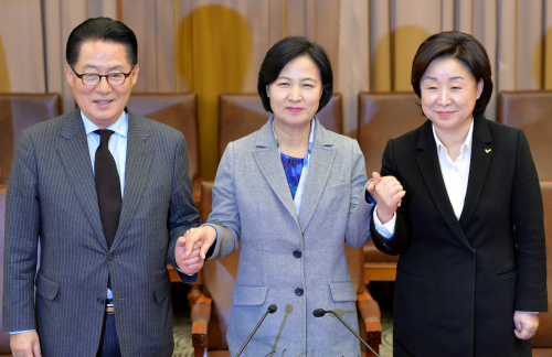 ▲ 작년 2월 야3당 대표 회동에서 손을 맞잡은 박지원 민주평화당 의원, 추미애 더불어민주당 대표, 심상정 정의당 의원(왼쪽부터).[투데이코리아=오주한 기자] 민주평화당(대표 조배숙), 정의당(대표 이정미)이 원내교섭단체를 구성할 전망이다. 정의당은 11일 의원총회에서 일부 이견에도 불구하고 교섭단체 추진에 합의했다고 밝혔다.