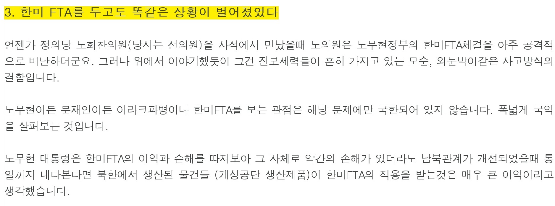 드루킹은 작년 5월24일 자신의 블로그에 올린 ‘문재인 정권에 위기가 닥쳐왔을 때의 마음가짐’ 제하 게시물에서 “언젠가 정의당 노회찬 의원(당시는 전 의원)을 사석에서 만났을 때 노 의원은 노무현정부의 한미FTA 체결을 아주 공격적으로 비난했다”고 주장했다. 노 원내대표는 17대 총선에서 국회에 입성했다가 2008년 4월 열린 18대 총선에서 낙선했다. 이후 19~20대 총선에서 내리 당선돼 현재 국회의원으로 재직 중이다.