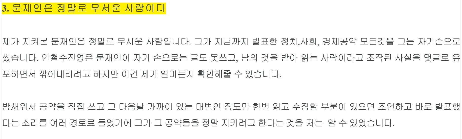 드루킹은 작년 4월4일 자신의 블로그에 올린 ‘문재인 집권은 시대정신이다 - 법과 경제시스템이 바로서는 시대를 향한 그의 의지’ 제하 게시물에서 “제가 지켜본 문재인은 정말 무서운 사람이다. 그가 지금까지 발표한 정치, 사회, 경제공약 모든 것을 그는 자기 손으로 썼다. 이건 제가 얼마든지 확인해줄 수 있다”고 주장했다.