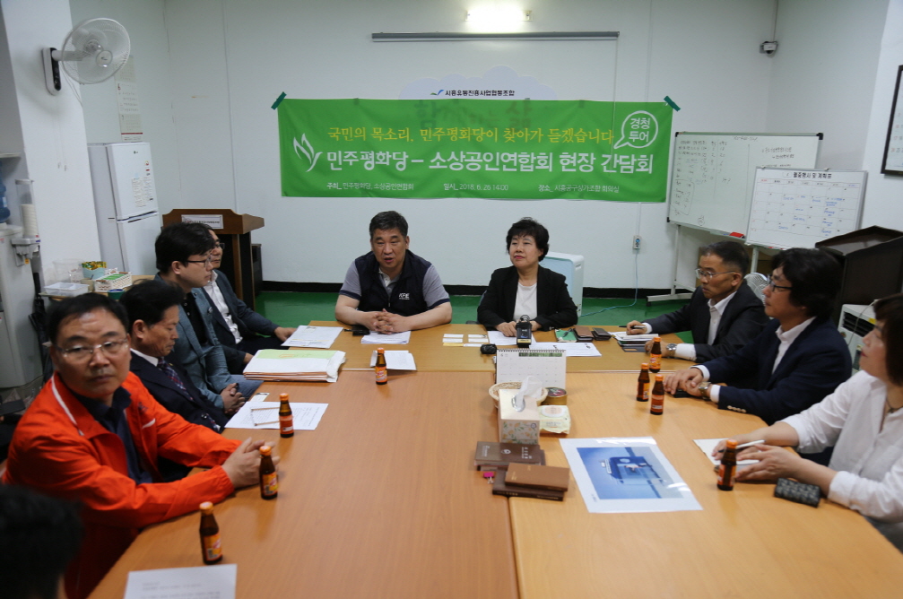 ▲ 지난 25일 서울 금천구 시흥공구상가 조합사무실에서 열린 '민주평화당·소상공인연합회 현장간담회'에서 최승재 소상공인연합회 회장(가운데 왼쪽)과 조배숙 민주평화당 대표가 참석했다.[투데이코리아=노철중 기자]소상공인연합회는 ‘민주평화당·소상공인연합회 현장간담회’가 26일 서울 금천구 소재 시흥공구상가 조합사무실에서 열렸다고 28일 밝혔다.