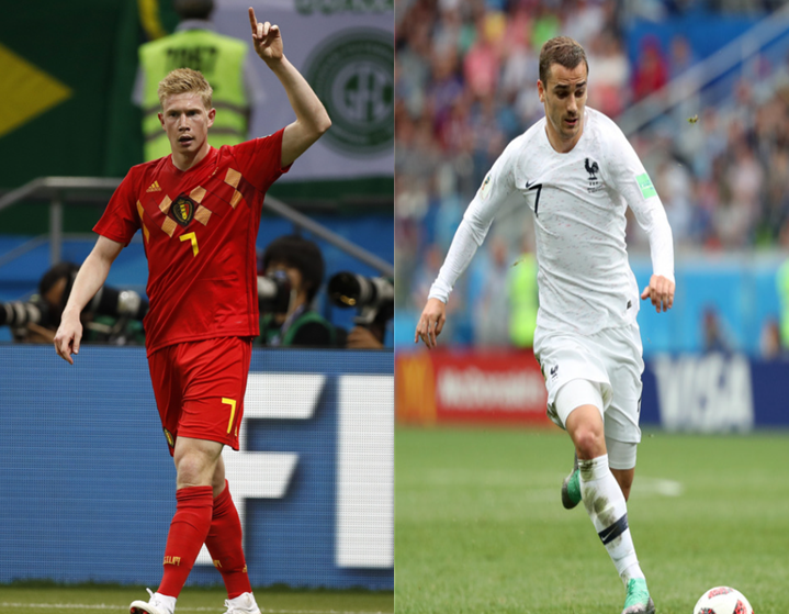 ▲ 벨기에의 케빈 더 브라위너(좌)와 프랑스의 앙투안 그리즈만(우).[투데이코리아=유한일 기자] 2018 국제축구연맹(FIFA) 러시아 월드컵의 미리보는 ‘결승전’으로 불리는 4강전에서 프랑스와 벨기에가 격돌한다.