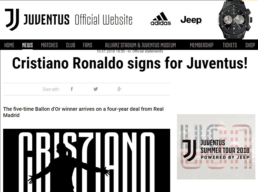 ▲ 유벤투스가 호날두의 영입을 공식 발표했다.11일 레알 마드리드는 공식 홈페이지를 통해 크리스티아누 호날두의 이적을 공식 발표했다. 이어 유벤투스 역시 1시간뒤 호날두의 영입을 공식적으로 알렸다. 호날두는 유벤투스와 4년 계약했으며 연봉은 300만 유로(한화 약392억)로 알려졌다.