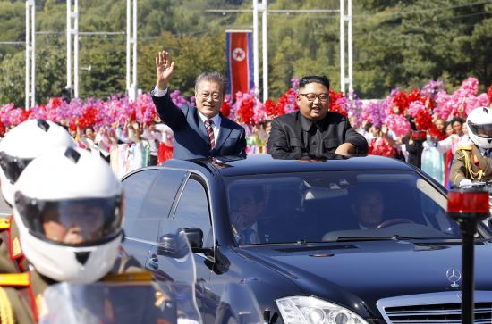 ▲ 18일 평양 순안공항에서 차량에 동승한 문재인 대통령, 북한 김정은.