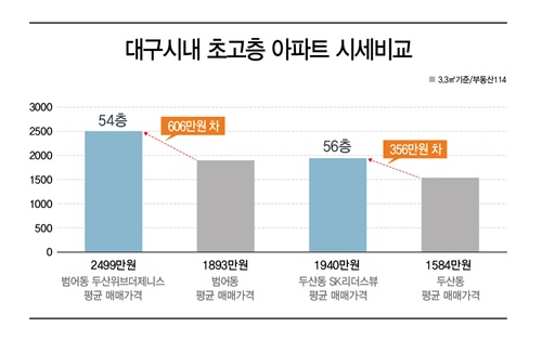 대표적으로는 대구광역시에 자리한 ‘범어동 두산위브더제니스’와 ‘두산동 SK리더스뷰’가 있다. 이들 단지는 각각 최고 56층, 54층의 대구 최고층 높이로 조성 돼 지역 시세를 이끄는 랜드마크 단지로 자리매김하고 있다. 실제 부동산 114에 따르면 범어동 두산위브더제니스의 현재(9월14일 기준) 3.3㎡당 매매가격은 2499만원이다. 이는 단지가 자리한 범어동의 평균 매매가격(1893만원)을 훨씬 웃도는 수치다. 또 ‘두산동 ‘SK리더스뷰’ 역시 현재(9월14일 기준) 3.3㎡당 매매가격이 1940만원으로, 단지가 자리한 범어동의 평균 매매가격(1584만원)을 훨씬 상회하고 있는 것으로 알려졌다.