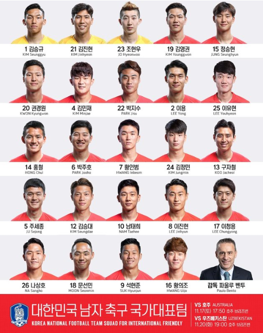 ▲ 11월 A매치에 참가하는 대한민국 남자축구 국가대표팀 명단. <자료=대한축구협회 제공>[투데이코리아=김민기 기자] 황인범(대전)이 손흥민(토트넘)의 등번호 7번을 달고 그라운드를 누빈다.