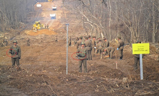 ▲ 최근 비무장지대에서 조우한 남북장병들. 북한군은 자동소총(빨간선 안)으로 무장한 반면 우리 장병들은 빈손이다(사진=국방부).