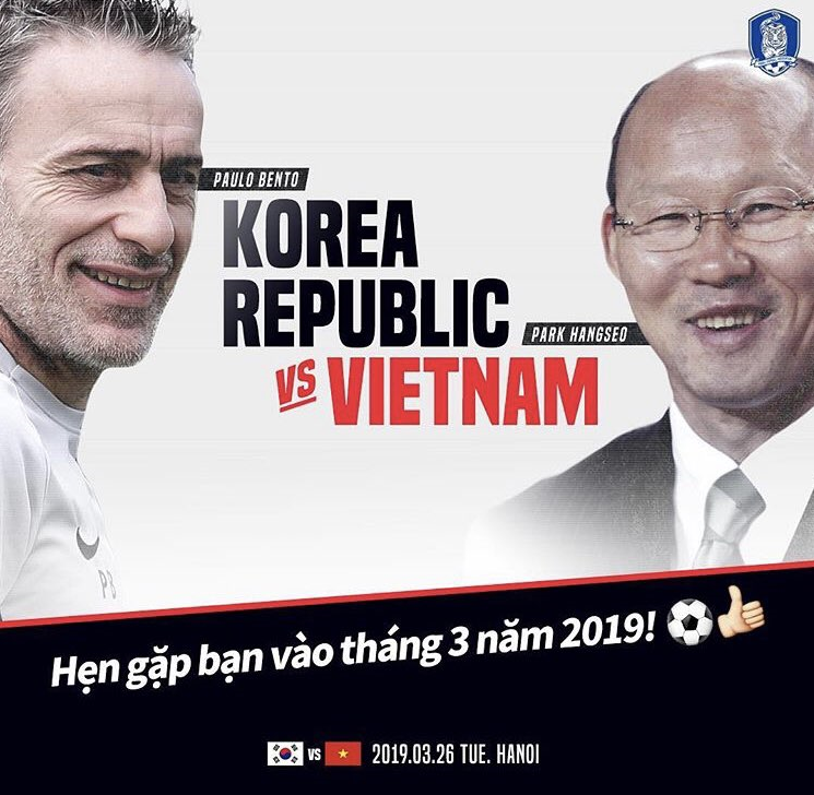 대한축구협회는 23일 공식 인스타그램에서 ‘최고 명장들의 한판 승부’라는 게시물을 통해 벤투호와 박항서호의 친선전 개최 소식을 알렸다.