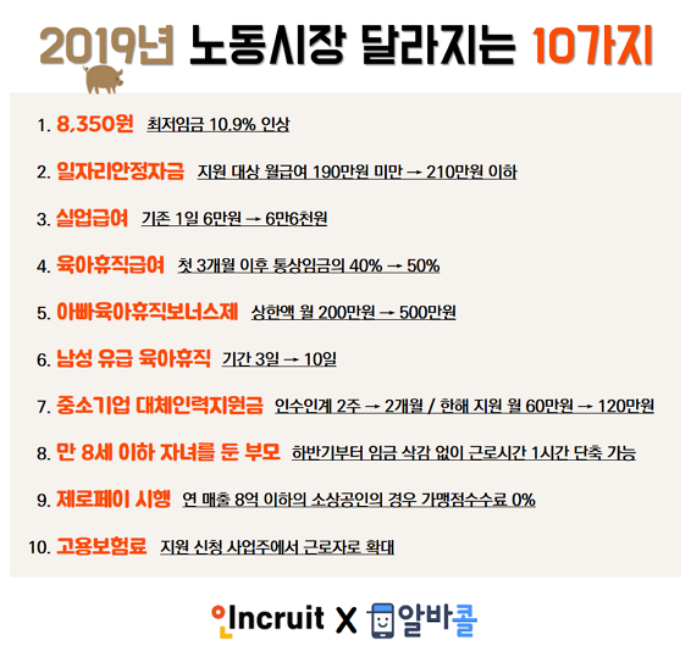 28일 취업포털 인크루트와 아르바이트 O2O 플랫폼 알바콜은 직장인이 참고해야 할 ‘기해년 노동시장 달라지는 10가지’를 엄선해 발표했다.