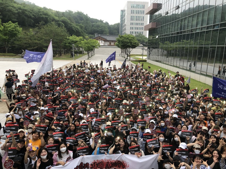 ▲ 사진=지난 6월 7일 진행된 성신여대 학생들의 A교수 재임용 반발 시위이에 성신여대 학생들은 지난 3월부터 학교 곳곳에 'A교수의 재임용을 취소하라'는 포스트잇과 대자보를 붙이고 거리를 행진했다. 하지만 학교 측은 '재임용 취소 불가' 입장을 공문을 통해 전달했다. 또, A교수에 대한 징계 과정을 공개하라는 총학생회의 요구에도 징계위원회는 공개할 수 없다고 답했다. 현재 상반기 학기가 끝났음에도 학생들과 학교의 갈등은 여전히 좁혀지지 않고 있다.