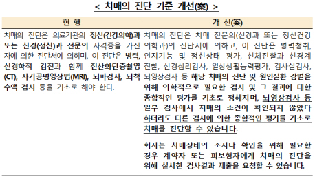 다만 보험사는 도덕적 해이를 막기 위해 보험금 청구의 토대가 된 전문의 검사결과 내용을 제출해 달라고 요구할 수 있게 했다. 또 보험금 지급 요건으로 ‘특정 치매질병코드’에 해당하거나 ‘치매약제를 일정 기간 처방받는 등’의 추가 조항도 약관에서 삭제하도록 금감원은 권고했다.