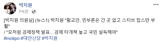 또한 박지원 대안정치연대 의원은 이날 페이스북에 “민부론은 간 곳 없고 돌아가신 스티브 잡스만 부활한 꼴”이라며 하늘색 셔츠와 남색 바지 정장 차림에 운동화를 신고 연단에 오른 황 대표의 모습을 스티브 잡스를 비유해 꼬집었다.