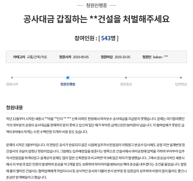 ▲ 세종 파라곤 협력업체 A씨가 청와대 국민청원 게시판에 게시한 청원(사진=청와대 국민청원 게시판 캡쳐)투데이코리아=김성민 기자 | 동양건설산업이 시공사인 세종시 ‘가락19단지파라곤’의 하자보수를 처리한 시공 협력업체가 국민청원을 통해 동양건설로부터 공사대금을 받지 못했다고 밝혔다.