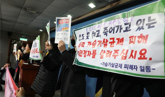 ▲ 전현희 더불어민주당 의원과 가습기피해자 가족들이 3일 오전 서울 여의도 국회 정론관에서 법사위의 조속한 통과를 촉구하며 기자회견을 하고 있다. 사진제공=뉴시스환경부와 한국환경산업기술원은 27일 서울 용산역 인근 회의실에서 제20차 구제계정 운용위원회를 열고 성인 간질성 폐 질환자 2명과 천식 질환자 3명 등 5명을 구제급여 상당지원(특별구제) 신규 대상자로 선정했다.