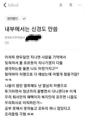 한편, 지난 9일 블라인드에는 LH 직원으로 추정되는 누군가가 "아무리 열폭(열등감 폭발)해도 난 열심히 차명으로 투기하면서 정년까지 꿀 빨면서 다니련다. 꼬우면 이직하든가"라는 글을 올려 공분을 샀다.