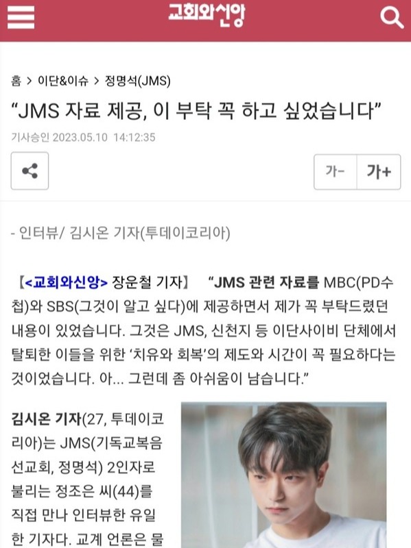 이에 김 씨는 지난 9일 오전 10시에 진행된 공판을 하루 앞두고 로스쿨 출신의 김엄연(52·변호사시험 7회) 변호사를 선임했다. 김 변호사는 현재 부산 지역에서 활동 중인 것으로 알려졌다. -JMS탈퇴자 “오장육부가 뒤틀리는 기분” 정명석 공범 정조은 혐의 부인···재판 참석한 오충익 목사 기사 다시보기